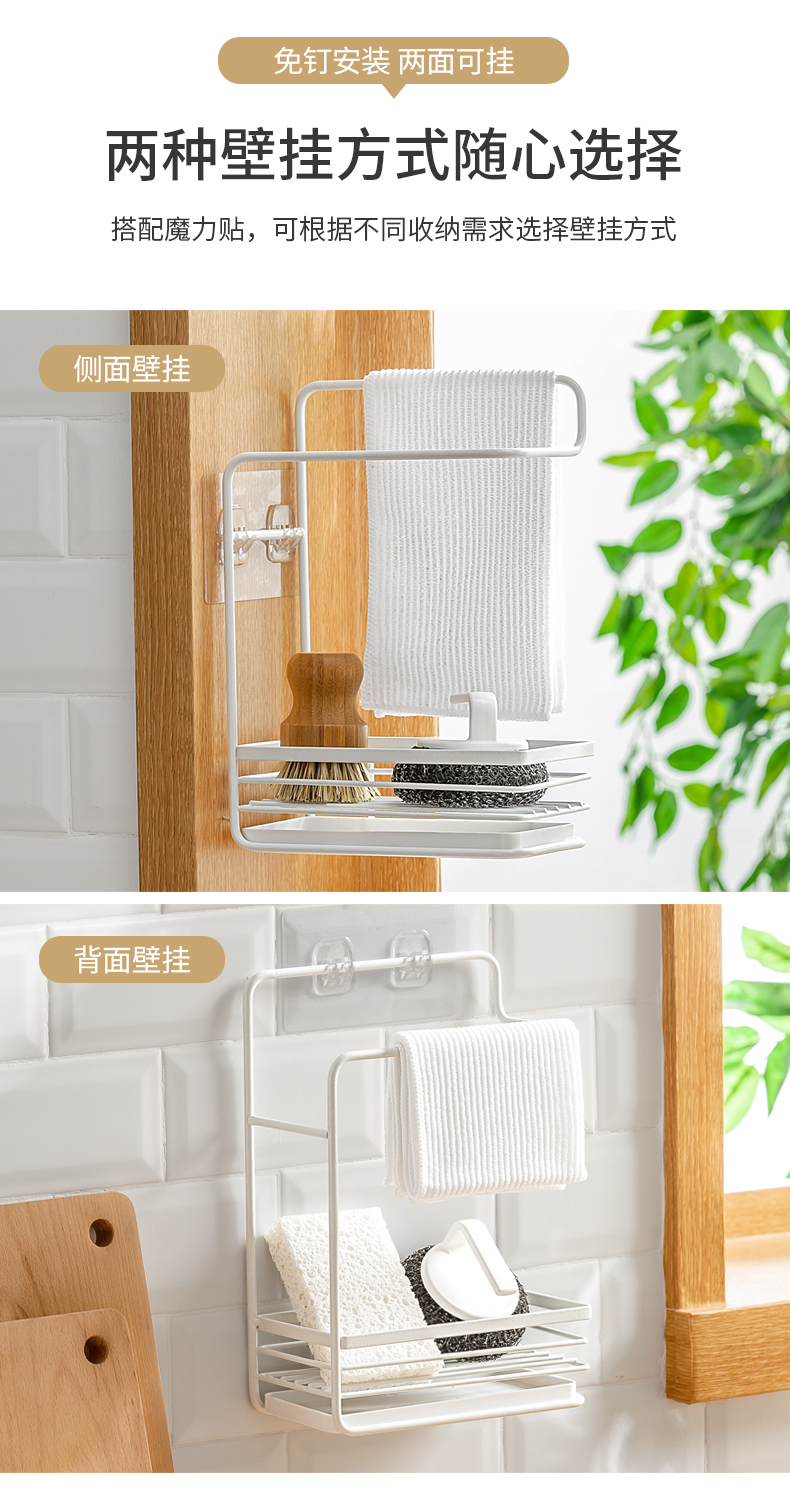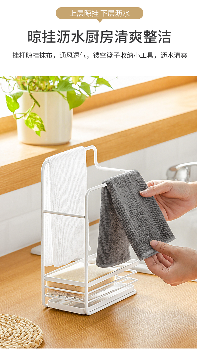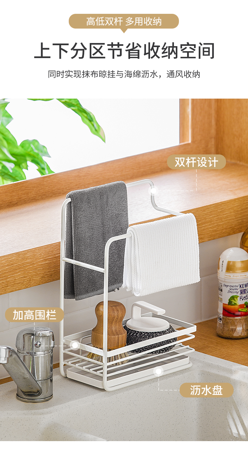 1、雙層收納:上下分區(qū),同時實(shí)現(xiàn)抹布晾掛與海綿瀝水