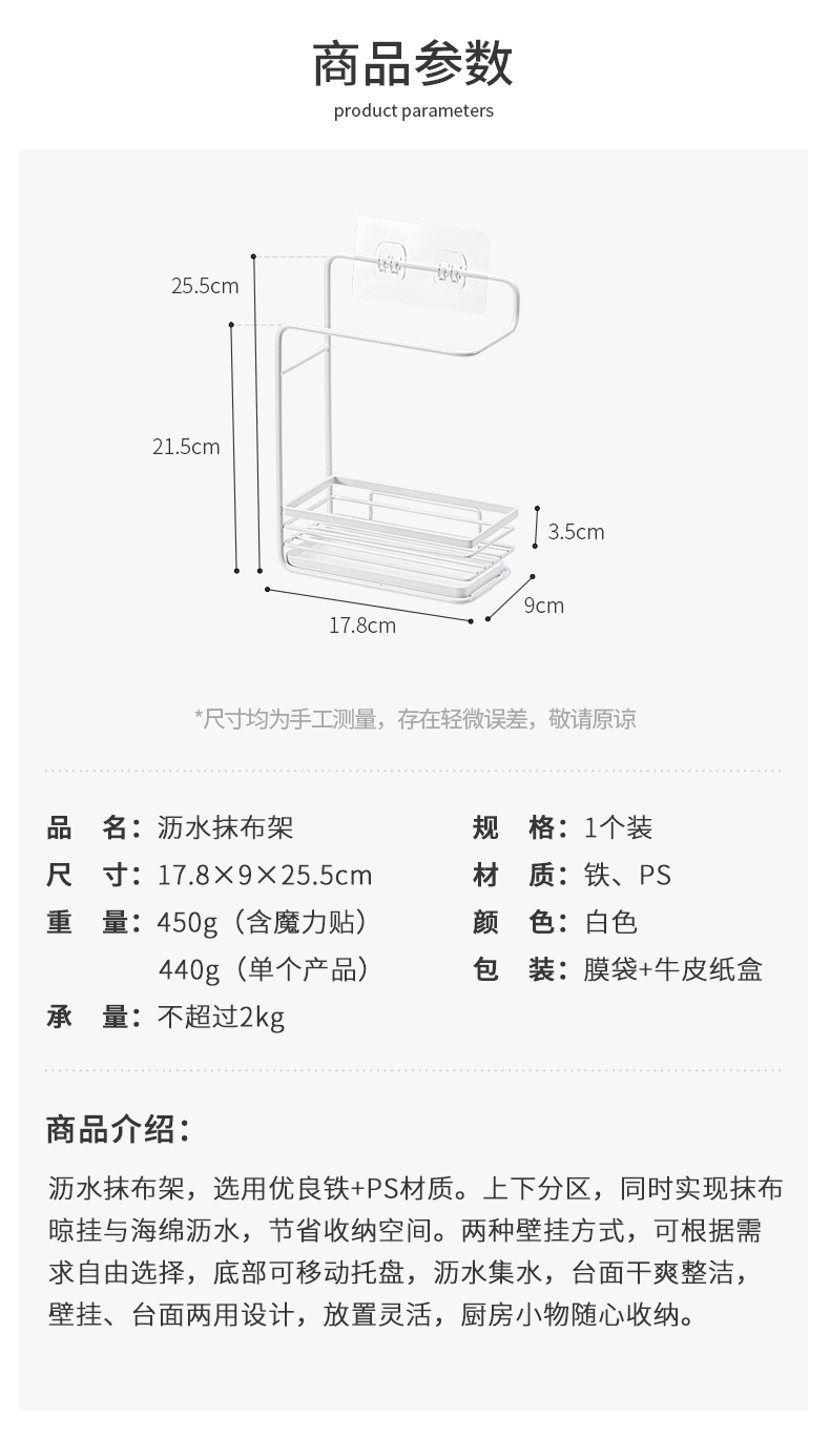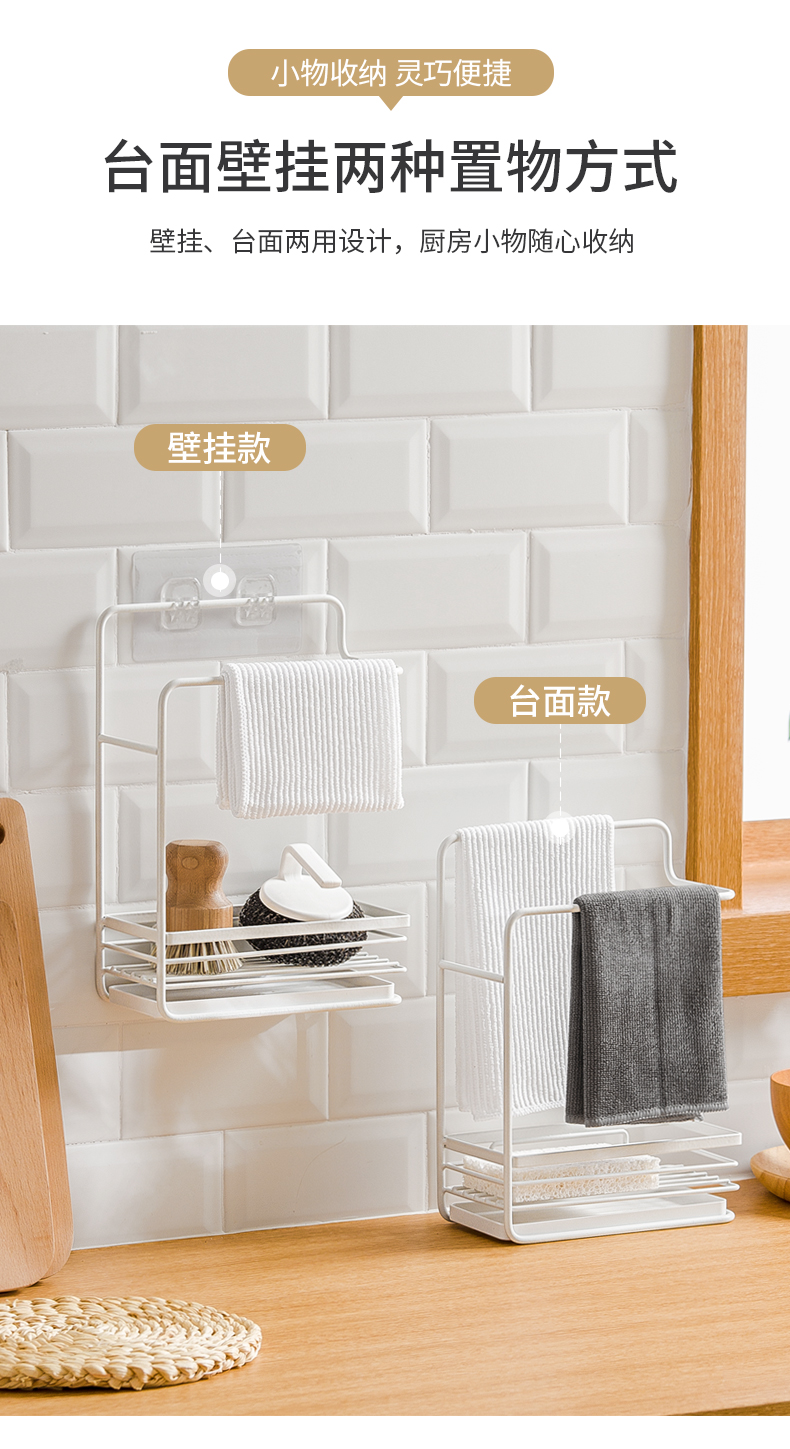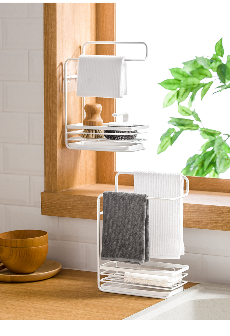1、雙層收納:上下分區(qū),同時實(shí)現(xiàn)抹布晾掛與海綿瀝水